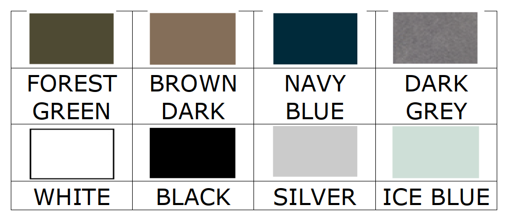 | Color | Black, Brown Dark, Dark Grey, Forest Green, Ice Blue, Navy Blue, Silver, White |